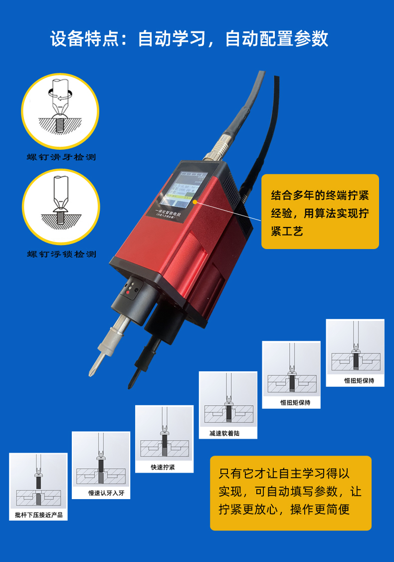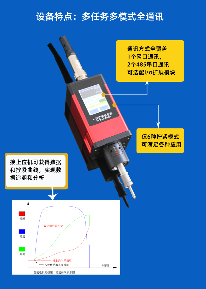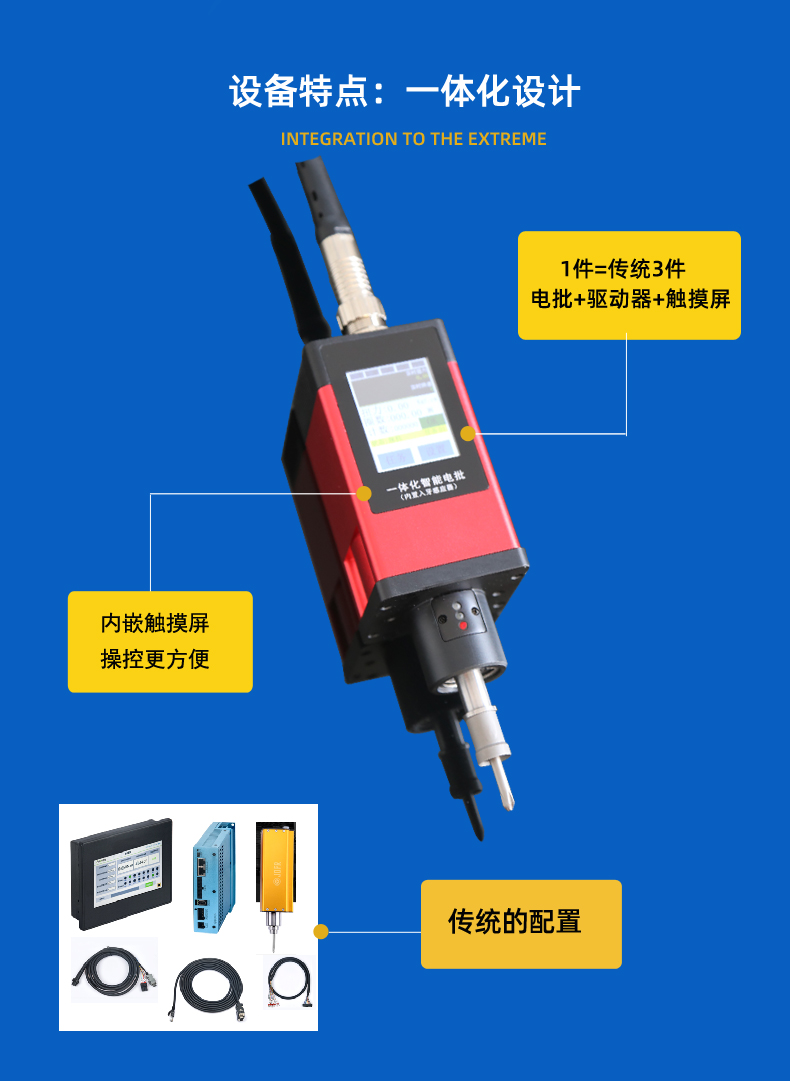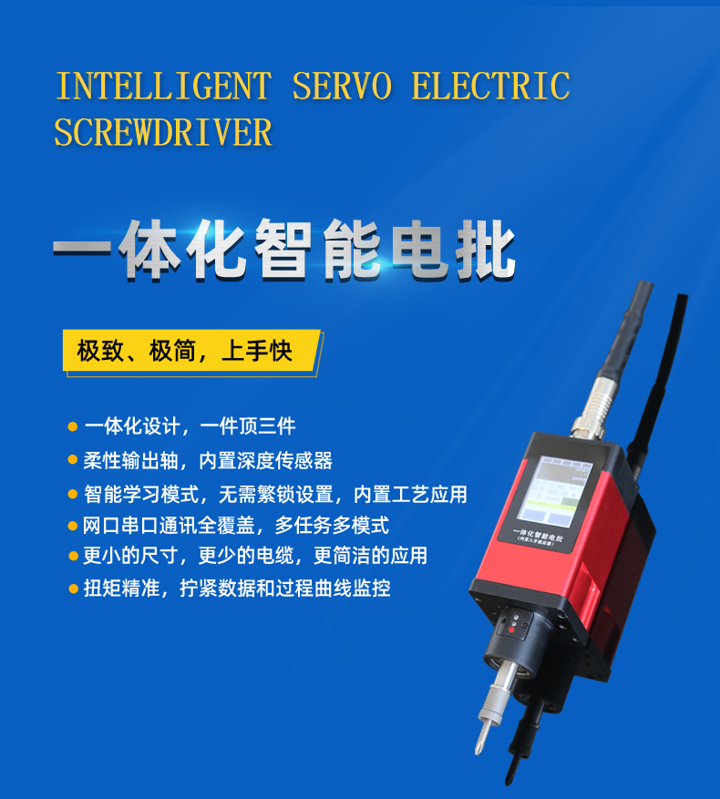 一體化智能電批特點(diǎn): 一件頂三件 柔性輸出軸,內(nèi)置深度傳感器 智能學(xué)習(xí)模式,無(wú)需繁鎖設(shè)置,內(nèi)置工藝應(yīng)用 網(wǎng)口串口通訊全覆蓋,多任務(wù)多模式